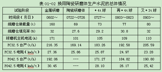 總之,¢4.2×13m聯合粉磨系統(tǒng)、水泥磨二倉改用陶瓷研磨體,進行的PC 32.5和PO 42.5水泥生產試驗,盡管是初步試驗,盡管臺時產量有所下降,已經取得了明顯的節(jié)電效果,初步試驗的總體情況見表01-02。