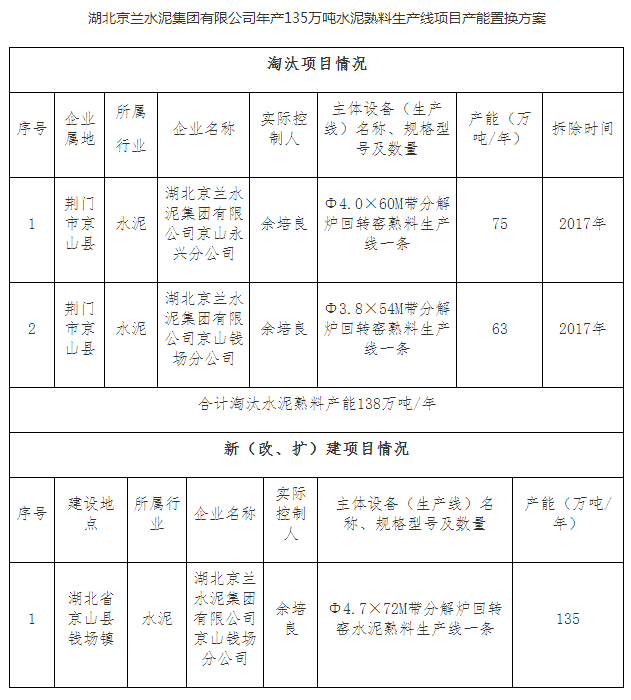 附:湖北京蘭水泥集團有限公司年產135萬噸水泥熟料生產線項目產能置換方案