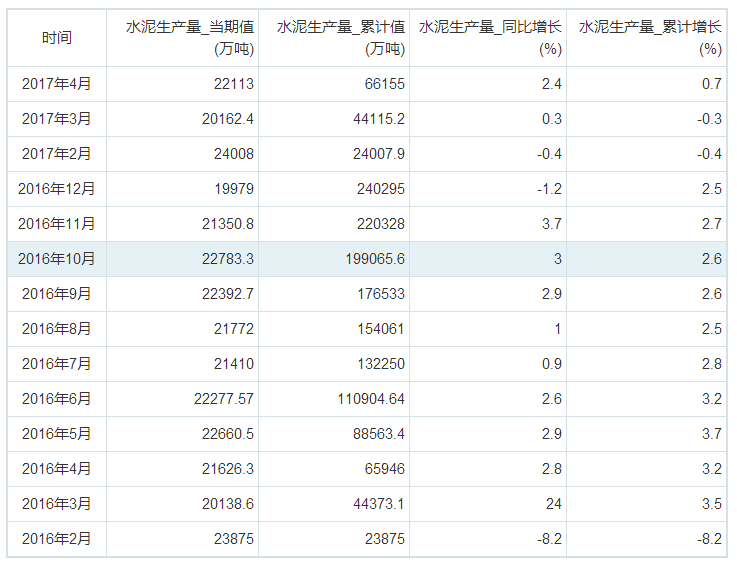 以下為2016年2月至2017年4月我國水泥生產量統計: