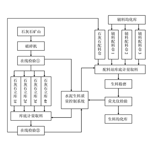 礦山石灰石經(jīng)破碎后進(jìn)行在線檢驗(yàn),按質(zhì)量的不同分別進(jìn)入四個(gè)(或多個(gè))石灰石立庫,根據(jù)配料要求在庫底計(jì)量取料,傳送帶上在線檢驗(yàn),然后進(jìn)入石灰石配料倉,配料站庫底計(jì)量取料后,進(jìn)行生料粉磨、熒光儀檢驗(yàn),最后進(jìn)入生料均化庫。
