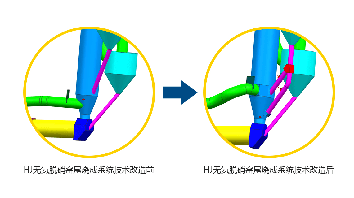 匯金無氨脫硝窯尾燒成系統是由河南匯金智能裝備有限公司研發團隊研發的新一代水泥熟料窯尾煅燒技術,以實際調研300多條新型干法水泥生產線為根基,采用分解爐高強還原燃燒控制技術,對回轉窯進行技術改造:四級旋風筒下料管對分解爐下料點位于三次風管0.5米之上,將每列單管下料更改為雙管下料;每單列增加一套分料閥、翻板閥、撒料箱及相應的下料管延長;三次風管的位置上移,在原三次風管與窯尾煙室縮口之間形成的強力還原區的上部。