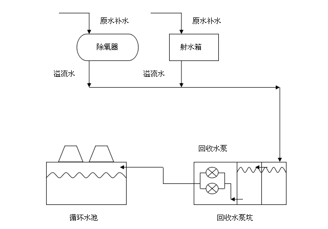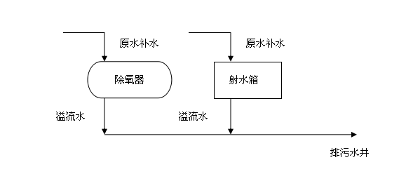 甘肅金泥集團有限責任公司干法二廠余熱電站總投資2800萬元,投產以來每年新增利潤數萬元,節約標準煤1.074萬噸,減排二氧化碳2.58萬噸。該余熱電站將原水通過活性炭過濾器及多介質過濾器降低水體的濁度、除去懸浮雜質、凈化水質,再經過反滲透系統除去水中的微粒、有機物質、膠體物和無機的陽離子、陰離子等水中雜質,進而得到除鹽水,再由物理除氧方式將其中氧氣剝離打進鍋爐,經高溫廢氣加熱至過熱蒸汽帶動汽輪發電機做功發電,做功后的蒸汽再經過循環水冷凝除氧進入鍋爐,如此往復形成一個汽水循環。要保證其穩定運行,就需要將其中每一個環節做得一絲不茍,但面對北方水質偏硬的現實問題,為了將循環水的硬度降至標準值不得不加大補水排污量,可是這樣又造成了不必要的水資源浪費,故對余熱電站內除氧器及射水箱的工業補水溢流水進行了下圖所示的回收水系統改造。