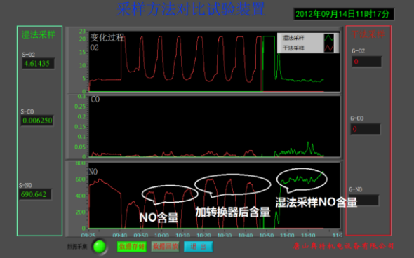 圖中,由于NO數(shù)據(jù)被分析系統(tǒng)消耗掉,比連續(xù)的綠色曲線低約35%。計(jì)算機(jī)就人為地加一個(gè)系數(shù)進(jìn)行補(bǔ)償。