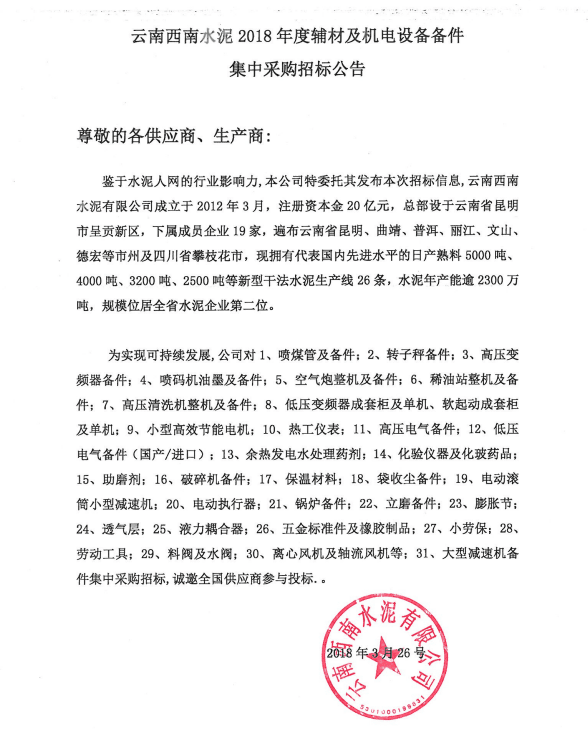 鑒于水泥人網的行業影響力,本公司特委托其發布本次招標信息,云南西南水泥有限公司成立于2012年3月,注冊資本金20億元,總部設于云南省昆明市呈貢新區,下屬成員企業19家,遍布云南省昆明、曲靖、普洱、麗江、文山、德宏等市州及四川省攀枝花市,現擁有代表國內先進水平的日產熟料5000噸、4000噸、3200噸、2500噸等新型干法水泥生產線26條,水泥年產能逾2300萬噸,規模位居全省水泥企業第二位。
