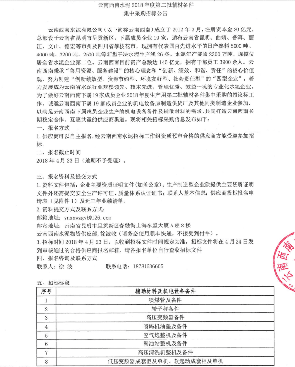 云南西南水泥2018年度第二批輔材備件集中采購招標公告