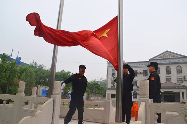 伴隨莊嚴而雄壯的國歌聲響起,全場肅立。大家個個士氣高昂、精神抖擻、昂首挺胸、深情地向國旗行注目禮,注視著五星紅旗冉冉升起,共同表達對祖國的無限忠誠以及濃濃的愛國之情。隨后大家集體宣誓公司訓導詞。