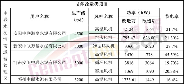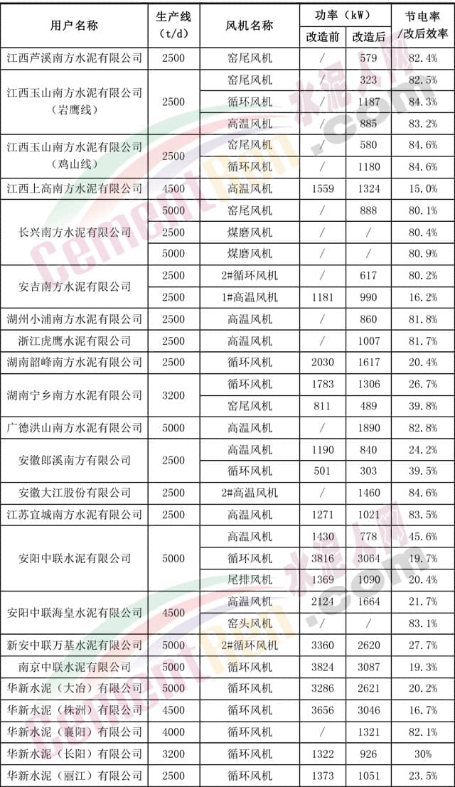 上海瑞晨水泥行業風機節能改造業績(部分)