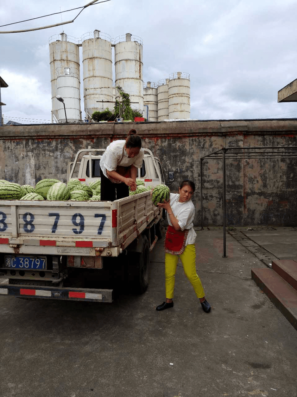 三、定時定點送涼茶、綠豆稀到現場,給員工分發西瓜