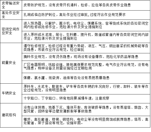 從目標的角度,以簡單有效的常識判斷安全管理的瓶勁是最合理的。安全管理的目標是優先避免重大安全事故發生,從這個角度出發,有效控制重大安全事故的發生就抓住了安全管理的瓶勁環節。要想有效控制重大安全事故的發生,必須熟悉重大安全事故發生的規律,擅于分析每一類重大安全事故所對應作業類型的現場隱患。找到重大事故發生的規律,事故隱患對應的現場薄弱點。我在這里列一張表附在后面,會列出水泥企業重大安全事故常見的類型,供大家參考。當然不同情況的水泥企業可能會有一些個案的重大隱患,可以自行研究。希望此表能幫助行業內的安全管理人員理清管理思路,為減少水泥從業人員的傷害,為更多家庭的平安健康盡一點綿薄之力。