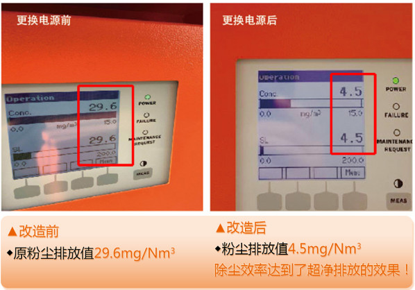 煤山南方水泥本次技改中,除塵器本體檢修和改造,是利用停窯檢修期間完成的。為驗證智能變頻脈沖電源的除塵效率,除塵電源是在生產(chǎn)期間進行不停窯更換的,更換前在線監(jiān)測顯示粉塵排放為29.6 mg/Nm3,更換完成后,監(jiān)測儀顯示粉塵排放很快降低至4.5 mg/Nm3左右,除塵效果顯著且直觀真實!