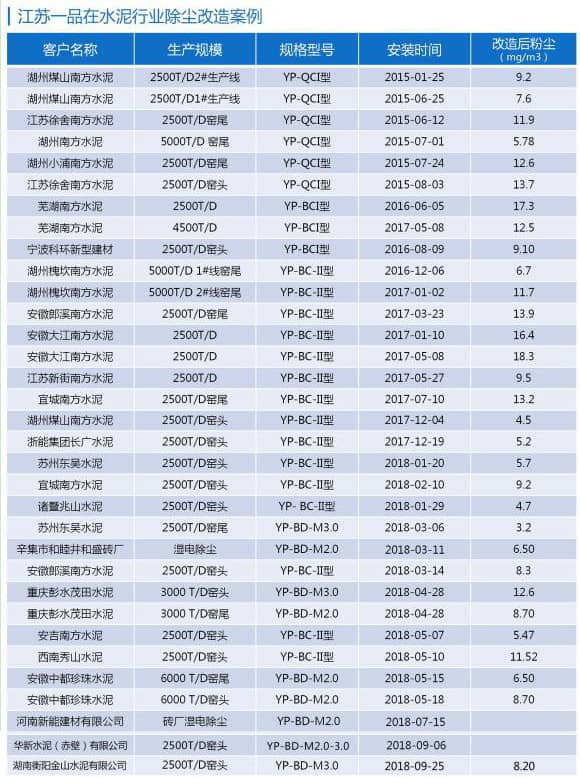 目前,該套電除塵超低排放改造技術(shù)和方案,已由江蘇一品環(huán)保在90余條水泥生產(chǎn)線上應(yīng)用和驗證,均獲得了非常顯著的效果。實踐證明,水泥行業(yè)原有的電除塵器,只要能確保除塵器本體各項工況完好,并對電場內(nèi)部加以技術(shù)改造,配合生產(chǎn)工藝的嚴(yán)格把控,選擇合適先進的除塵電源,使粉塵達到超低排放,完全可以實現(xiàn)!