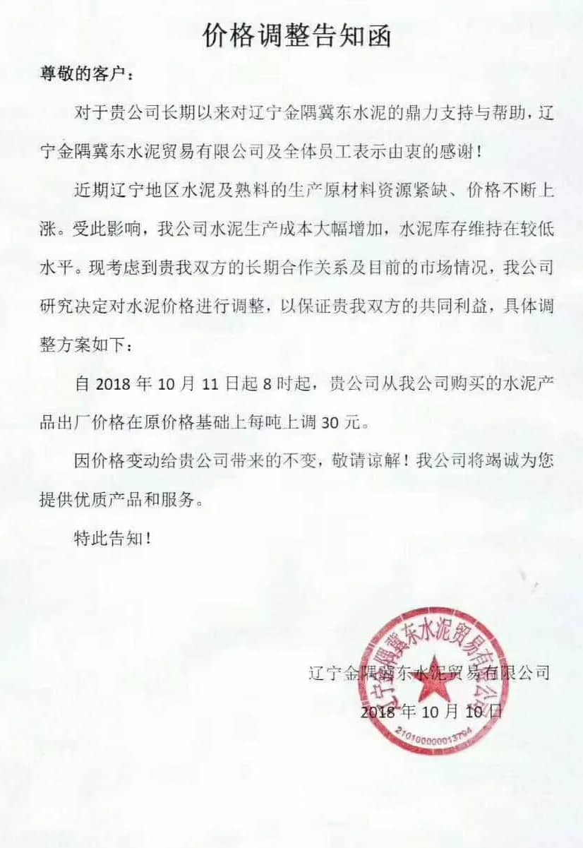 繼華北、西南、華南、華中地區水泥價格紛紛上調后,遼寧地區水泥價格迎來上漲。 遼寧金隅冀東水泥貿易有限公司發布價格調整函稱,近期遼寧地區水泥及熟料的生產原材料資源緊缺、價格不斷上漲。考慮到目前市場情況,公司研究決定自2018年10月11日8時起,水泥產品出廠價格在原價格基礎上每噸上調30元。 漲價函如下: