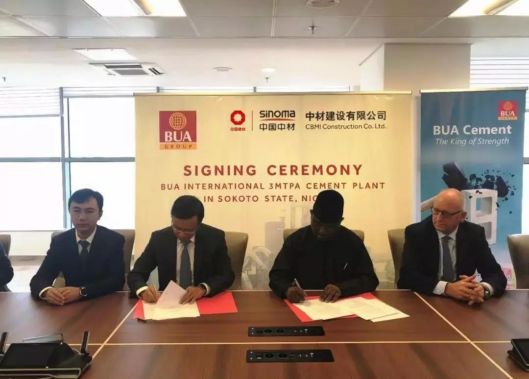 BUA集團(tuán)主席Mr.RABIU和中材建設(shè)有限公司執(zhí)行董事童來茍先生分別代表雙方在合同上簽字,BUA集團(tuán)水泥板塊首席運(yùn)營官M(fèi)r. FINN與中材建設(shè)有限公司副總經(jīng)理李明見證了合同的簽約。