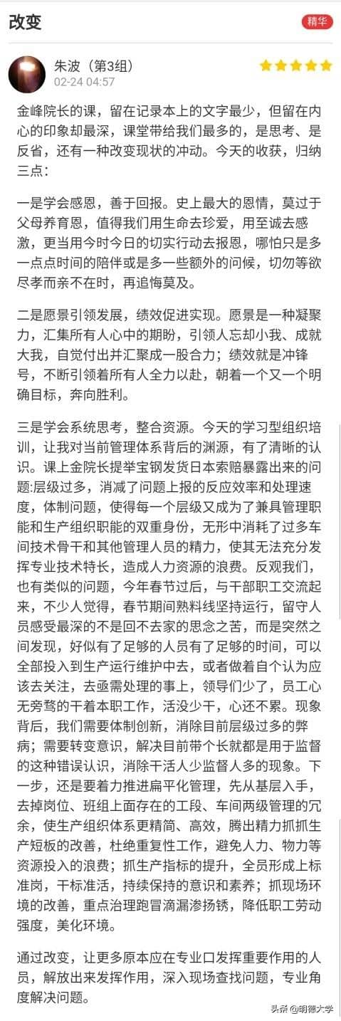 此次強化培訓(xùn),明德經(jīng)綸旨在通過學(xué)習(xí)型組織的自我超越、改善心智模式、建立共同愿景,系統(tǒng)思考通過學(xué)習(xí)、實踐、總結(jié)、提煉和跟蹤,將學(xué)到的知識轉(zhuǎn)化為智力,融會貫通,上升為理解和解決問題的實際能力。通過量身定制的系統(tǒng)培訓(xùn),為東華水泥有限公司的安全生產(chǎn)、精益管理、高效運營,打造和建設(shè)一批高素質(zhì)的人才隊伍,成為企業(yè)發(fā)展的內(nèi)在推動力量。
