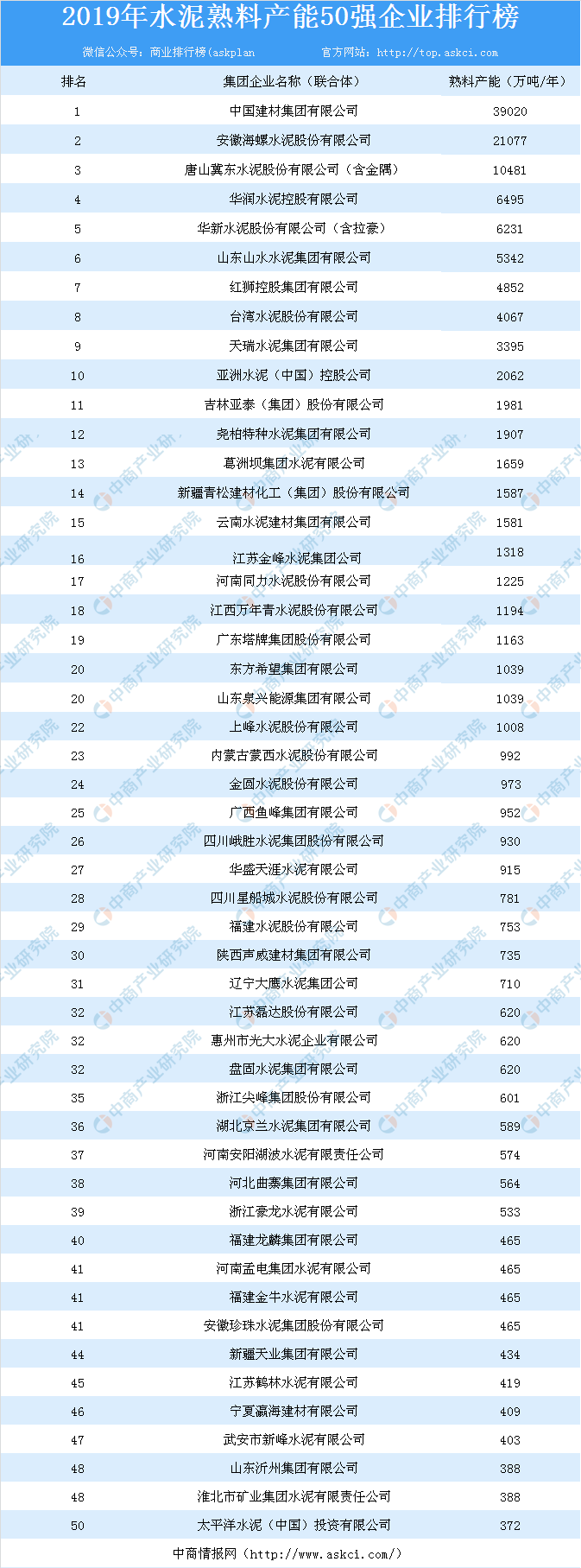據(jù)數(shù)據(jù)統(tǒng)計顯示:前10家大企業(yè)集團的水泥熟料年產(chǎn)能達到10.3億噸,占全國總產(chǎn)能的57%,與上年相比保持持平。以下是2019年全國水泥熟料產(chǎn)能50強企業(yè)詳細排名情況: