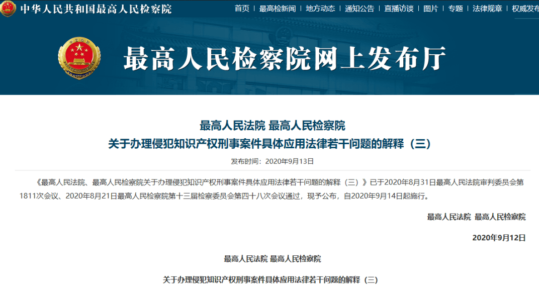 而《最高人民法院、最高人民檢察院關于辦理侵犯知識產權刑事案件具體應用法律若干問題的解釋(三)》于近日發布,自2020年9月14日起施行。