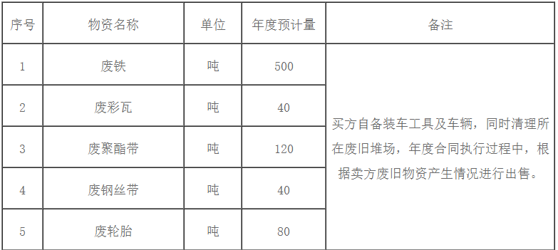 根據《廢舊物資管理辦法》,為規范公司廢舊物資出售管理,保證廢舊物資出售過程的公開、公平、公正,興業海螺計劃對2021-2022年公司內廢舊物資進行公開招標,本次招標主要針對日常產生的廢舊物資以及部分廢鋼球一次性的處置出售,對年度內技改項目大批量廢舊物資的集中處置將另行招標,歡迎具備廢舊物資回收條件的公司參加本次招標活動,現將有關事項公示如下: