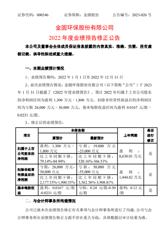 2023年4月16日晚間,金圓股份業績爆雷,預計2022年業績由盈利轉為虧損,預計虧損1.9億元至2.3億元,同比下降320.16%至366.51%。扣非后虧損5億至5.5億元,同比下降3562.56%至3908.81%。