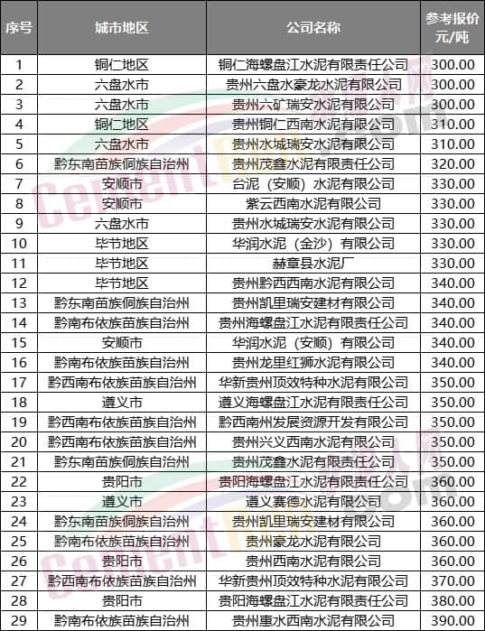 4月中旬前后,水泥人網信息中心重點監控的貴州省內29家水泥企業P.O42.5散裝水泥參考報價在300-390元/噸。安順地區臺泥水泥、華潤水泥、西南水泥報價在330-340元/噸,同區域企業之間價格基本持平。