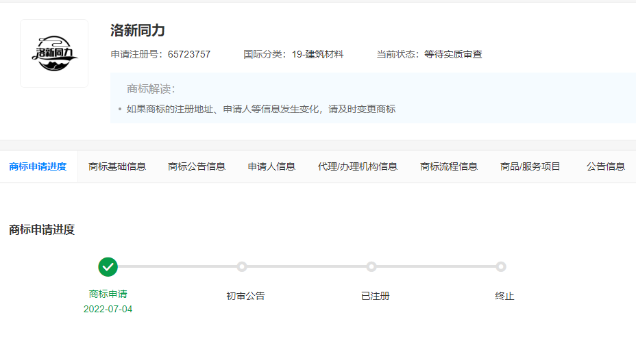 “洛新同力”,商標(biāo)申請人為洛陽畔山水泥有限公司。2023年2月10日商標(biāo)注冊申請被駁回,當(dāng)前狀態(tài)為等待實質(zhì)審查。