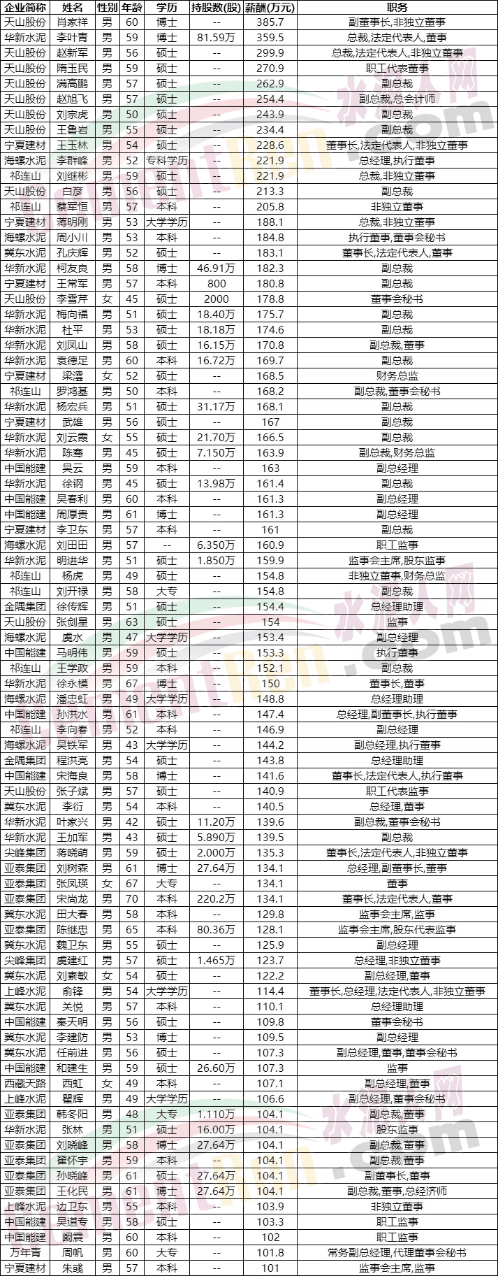 反觀水泥行業(yè),已公布薪酬的252位高管中,年薪超過500萬的高管為零,年薪超過200萬的僅13位。其中年薪最高的是天山股份副董事長(zhǎng)肖家祥,薪酬為385.7萬元;第二位是華新水泥李葉青薪酬為359.5萬元,同時(shí)持華新水泥股票81.59萬股。按照4月28日華新水泥最新股價(jià)14.75元計(jì)算,81.59萬股相當(dāng)于1200多萬元。按此計(jì)算拿錢最多的還是華新水泥總裁李葉青。