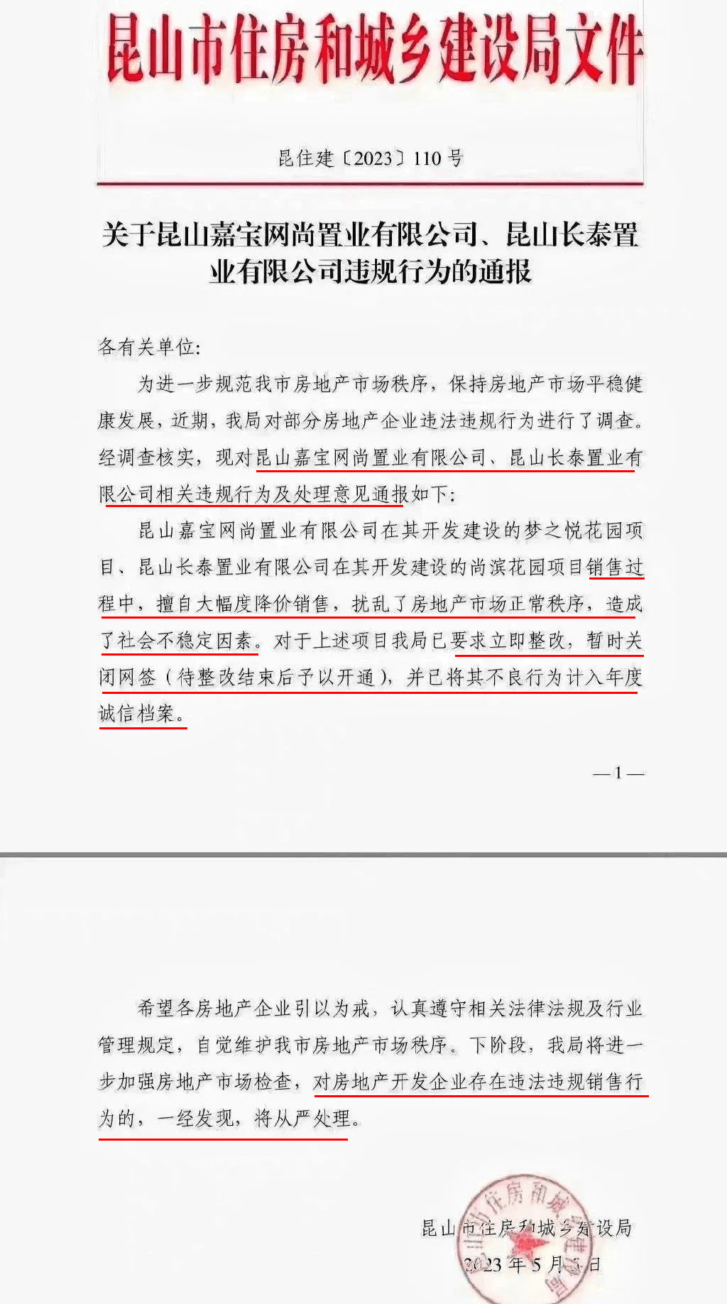 日前,江蘇蘇州昆山住建局在微信群發布一則通報文件,兩家房企因在售房過程中,擅自大幅度降價銷售,擾亂了房地產市場正常秩序被處罰。