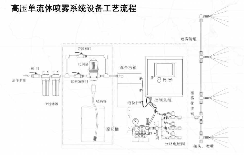 與傳統噴涂設備相比,使用高壓單流體噴霧系統不需要灑水裝置,水資源利用率高,用水量少,同時霧化水不會聚集,不會產生二次污染,維護成本低,節省了大量的人力、物力和水資源。具有以下特點和優勢: