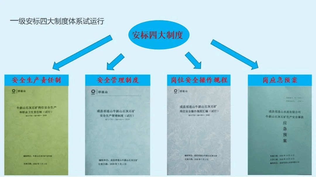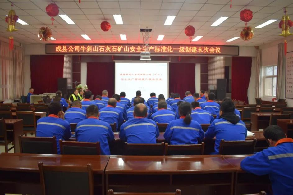 成縣分公司于2014年開展礦山安全生產標準化創建工作,于2016年1月通過二級礦山安全生產標準化并授牌,持續通過復評授牌。2019年11月啟動礦山一級安全生產標準化創建工作,已完成四大體系文件建設:管理制度80個、安全生產責任制58項、安全操作規程70項、綜合應急預案一章、專項應急預案7章、現場處置方案9章、已完成備案并持續運行,崗位達標工作持續開展。