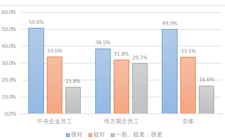 3.部分國企黨組織的海外品牌傳播能力有待進一步提升。在國企深度參與國際市場的背景下,部分國企國際化傳播經驗不足、海外宣傳能力不足的問題愈發突出,部分國企黨組織出現一定程度的功能缺位。國企“走出去”與品牌傳播建設并不同步,品牌傳播中的弱點已經成為國企“走出去”過程中的巨大隱患。相關研究指出,中國國企“傳播與公關能力不足,媒體溝通、政府公關有待加強”“國際化營銷經驗還比較欠缺”。課題調研結果顯示,受訪的中央企業職工中,只有50.6%的員工認為企業黨組織在領導打造世界一流品牌過程中作用發揮得很好,還有15.8%的員工認為做得一般、較差或很差,而地方國企這兩項比例分別為38.5%和29.7%(見圖5)。可見,國企職工對黨組織領導打造世界一流品牌的表現總體上認可度不及預期。