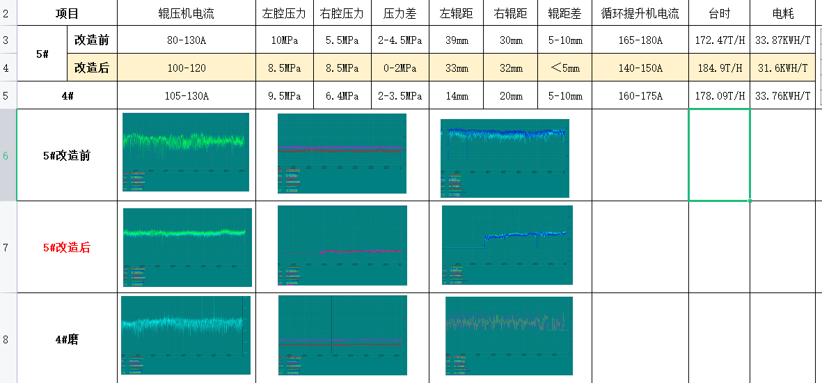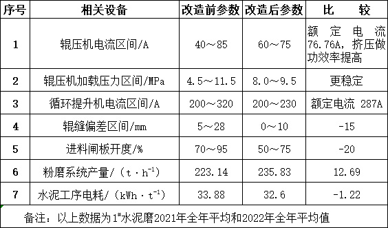 在相同的質(zhì)量控制指標(biāo)前提下,輥壓機改造后的聯(lián)合粉磨系統(tǒng)產(chǎn)量由223.14t/h提高至235.83t/h,增產(chǎn)幅度12.69%。粉磨電耗由33.88kWh/t降至32.6kWh/t,電耗降低了1.22 kWh/t實現(xiàn)清潔生產(chǎn);
