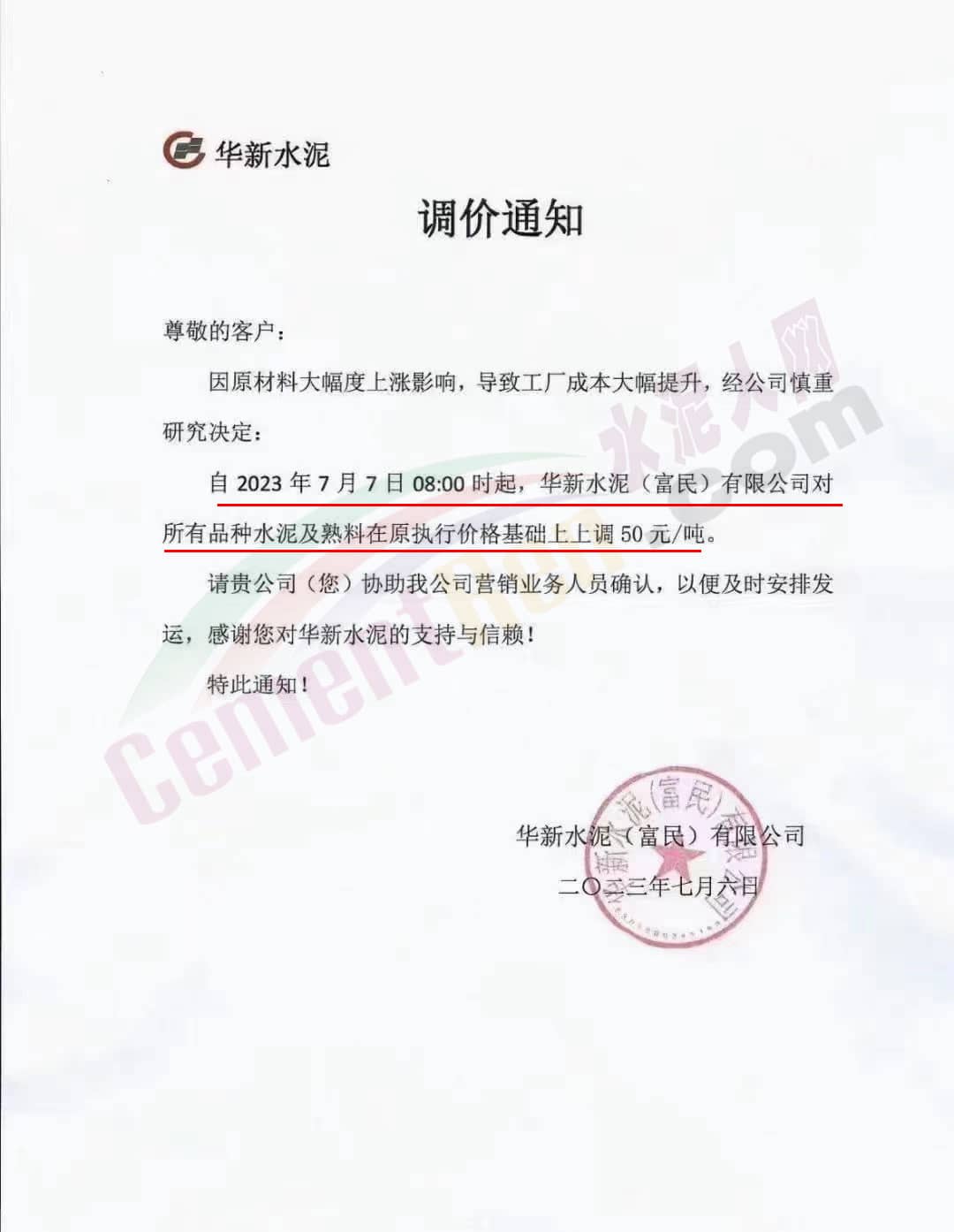 華新水泥(富民)有限公司通知,因原材料大幅度上漲影響,導(dǎo)致工廠成本大幅提升,經(jīng)公司慎重研究決定:自2023年7月7日8時(shí)起,華新水泥(富民)有限公司對所有品種水泥及熟料在原執(zhí)行價(jià)格基礎(chǔ)上上調(diào)50元/噸。