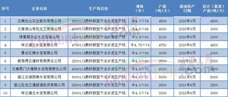 另外,云南工信廳發布的2022年云南省在建水泥熟料生產線清單中列出截至2022年末在建生產線共有6條。