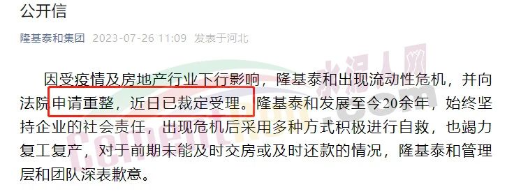 近日,隆基泰和發(fā)布公開信,因受疫情及房地產(chǎn)行業(yè)下行影響,企業(yè)出現(xiàn)流動性危機,并向法院申請重整,近日已裁定受理。其還表示,出現(xiàn)危機后采用多種方式積極進行自救,也竭力復(fù)工復(fù)產(chǎn),對于前期未能及時交房或及時還款的情況,隆基泰和管理層和團隊深表歉意。