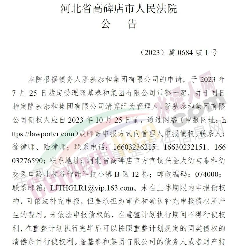 據(jù)水泥人網(wǎng)了解,7月25日,隆基泰和集團新增一起破產(chǎn)重整案件,破產(chǎn)重整的申請人和被申請人均為隆基泰和集團,經(jīng)辦法院為河北高碑店法院。另外,高碑店市人民法院定于2023年11月9日上午9時30分通過網(wǎng)絡(luò)會議形式召開第一次債權(quán)人會議,依法申報債權(quán)的債權(quán)人有權(quán)參加債權(quán)人會議。
