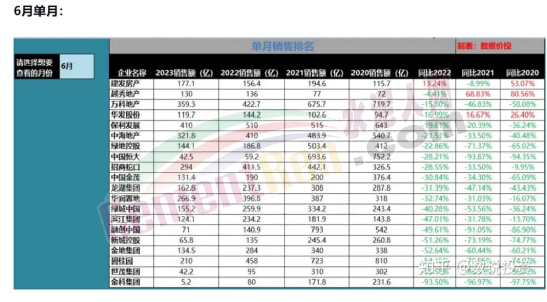 公開數(shù)據(jù)顯示,今年6月份碧桂園、濱江、新城控股、中鐵建、遠洋等房企的銷售額均同比出現(xiàn)了腰斬,另外招商、華潤、金茂、龍湖、卓越等房企6月銷售額同比的跌幅也都在30%上下,萬科、保利、中海、綠地、華發(fā)等房企6月銷售額同比的跌幅也都在20%左右。6月房企實現(xiàn)銷售操盤金額5267.4億元,單月業(yè)績同比降低28.1%。