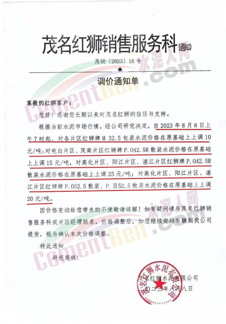 水泥人網(wǎng)通訊員消息:日前,茂名紅獅銷售服務(wù)科發(fā)通知稱,根據(jù)當(dāng)前水泥市場(chǎng)行情,經(jīng)公司研究決定,自2023年8月8日上午7時(shí)起,對(duì)各片區(qū)紅獅牌M32.5包裝水泥價(jià)格在原基礎(chǔ)上上調(diào)10元/噸;對(duì)電白片區(qū)、茂南片區(qū)紅獅牌PO42.5R散裝水泥價(jià)格在原基礎(chǔ)上上調(diào)15元/噸;對(duì)高化片區(qū)、陽(yáng)江片區(qū)、湛江片區(qū)紅獅牌P.O42.5R散裝水泥價(jià)格在原基礎(chǔ)上上調(diào)25元/噸;對(duì)高化片區(qū)、陽(yáng)江片區(qū)、湛江片區(qū)紅獅牌P.O52.5散裝、PII52.5散裝水泥價(jià)格在原基礎(chǔ)上上調(diào)20元/噸。