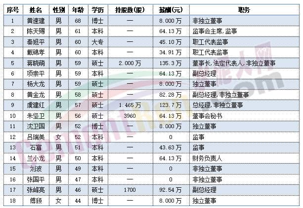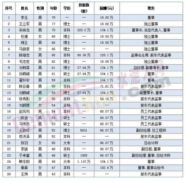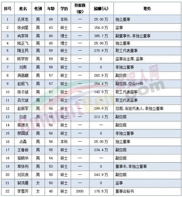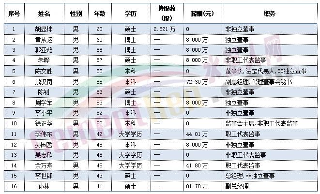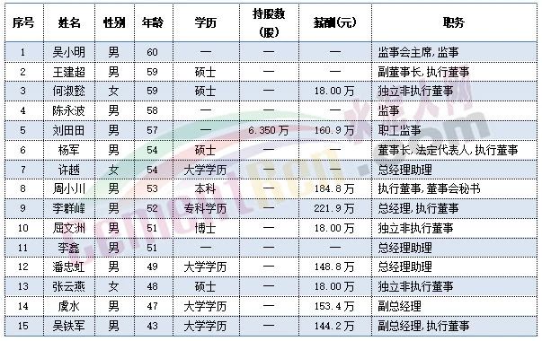 祁連山董事長脫利成今年60歲,總裁劉繼彬、副總裁王學政今年59歲,副總裁劉開祿今年58歲。