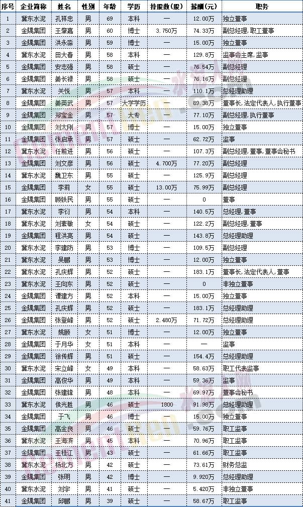 祁連山水泥總裁劉繼彬、海螺水泥副董事長王建超;華新水泥總裁李葉青;尖峰集團董事長蔣曉萌、西部水泥總工程師王建禮;亞泰集團董事翟懷宇在內(nèi)的18位上市公司高管為1964年生人,今年59歲。