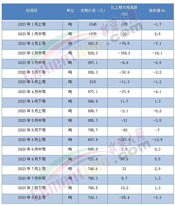 煤炭價格方面,繼6月中旬開始回暖后至8月上旬再次下滑25.4元/噸。市場貿易商表示,立秋之后天氣轉涼,電廠用煤量下降。同時遇水泥、鋼鐵等市場淡季,貿易商囤貨意愿不強,煤價失去支撐回落。以山西大混(5000大卡)為例,2023年6月中旬持續5期連漲后,至2023年8月上旬回落25.4元/噸至743.1元/噸。