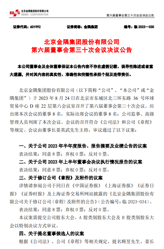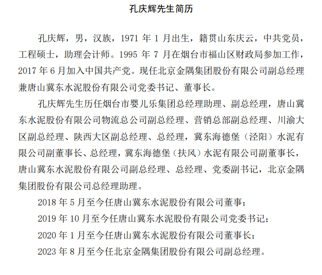 金隅冀東24日晚間公告,提名顧昱先生、姜長祿先生為公司董事候選人。聘任顧昱先生為公司總經(jīng)理,聘任孔慶輝先生為公司副總經(jīng)理,任期與本屆董事會任期一致,同時孔慶輝先生不再擔(dān)任公司總經(jīng)理助理。
