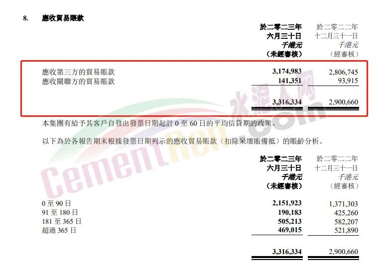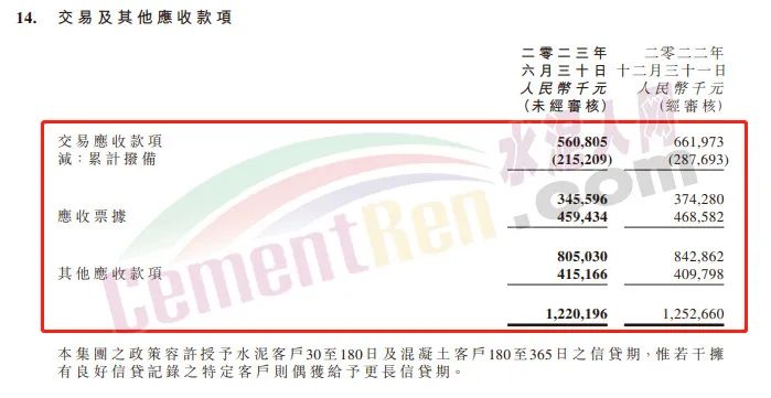 2023年上半年華潤水泥應收賬款33.16億。