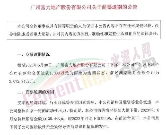 截至6月30日,廣州富力及下屬子公司有兩筆金額達到1000萬元的商票為逾期狀態,前述商票逾期金額合計為3072.74萬元。此前,富力地產由于商票逾期,被債權人廣東祥正商貿有限公司、廣州市廣豐混凝土有限公司以“不能清償到期債務且明顯缺乏清償能力”申請破產重整。