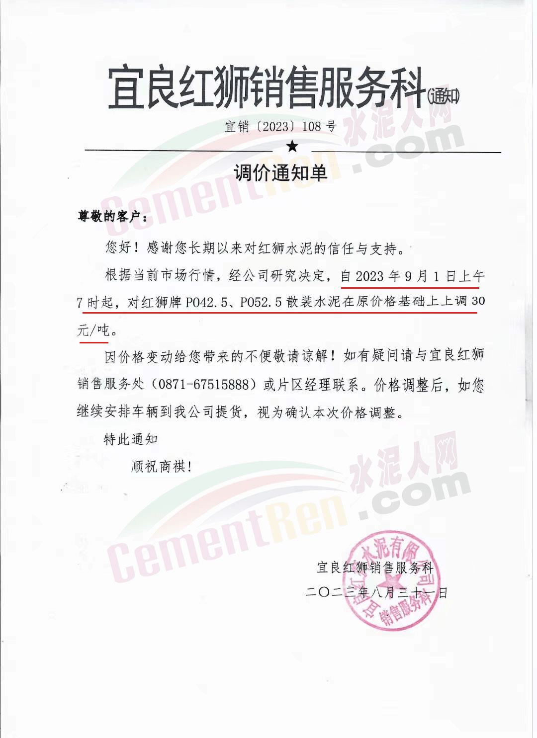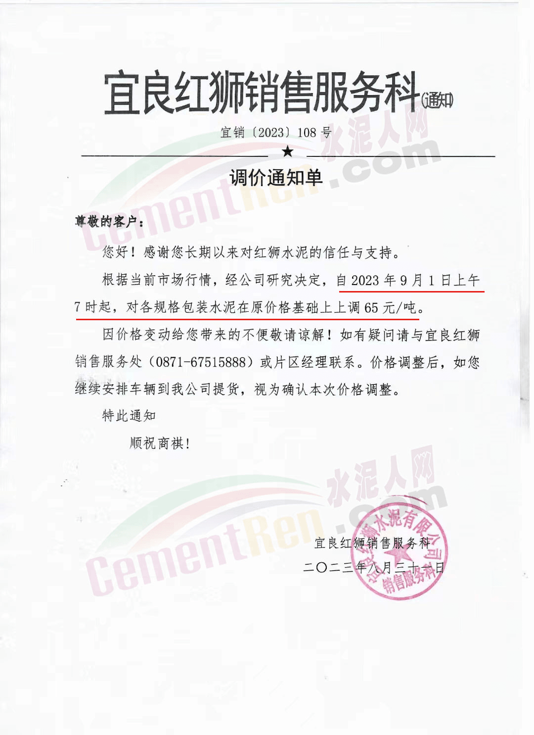 宜良紅獅銷售服務科通知,根據當前市場行情,經公司研究決定自2023年9月1日上午7時起,對各規格包裝水泥在原價格基礎上上調65元/噸。對紅獅牌PO42.5、PO52.5散裝水泥在原價格基礎上上調30元/噸。