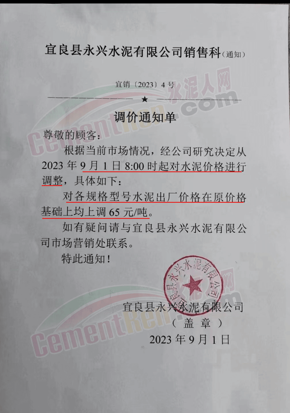 宜良縣永興水泥有限公司通知,根據當前市場情況,經公司研究決定從2023年9月1日8時起對各規格型號水泥出廠價格在原價格基礎上均上調65元/噸。