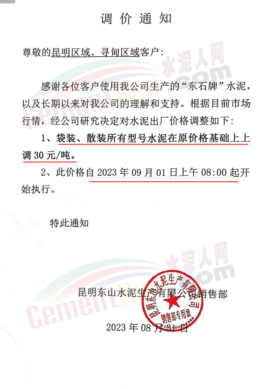 昆明東山水泥生產有限公司銷售部通知,根據目前市場行情,經公司研究決定自2023年9月1日上午8時起對袋裝、散裝所有型號水泥在原價格基礎上上調30元/噸。