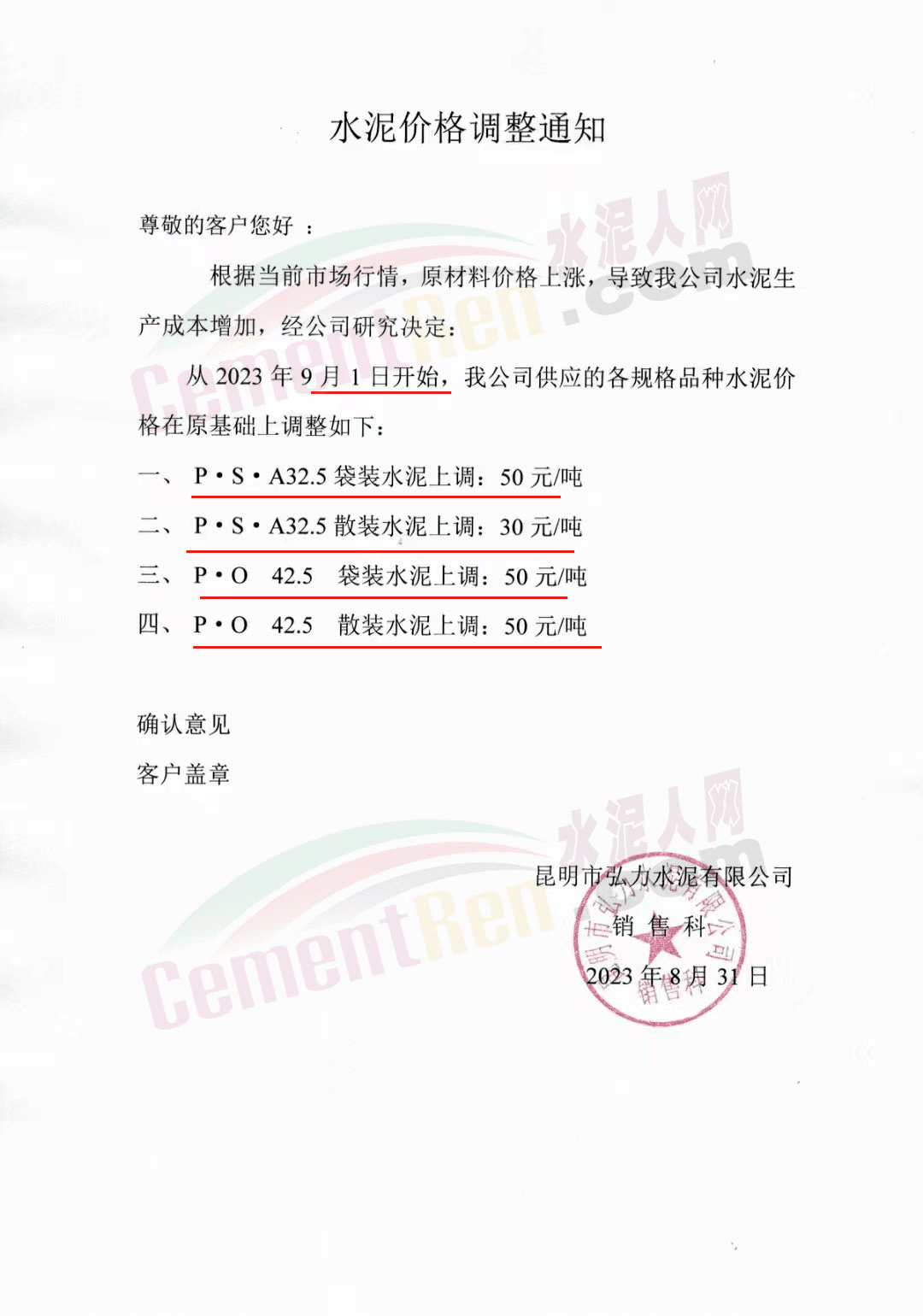 昆明市弘力水泥有限公司通知,根據當前市場行情,原材料價格上漲,導致公司水泥生產成本增加,經公司研究決定從2023年9月1日開始,公司供應的P·S·A32.5袋裝水泥上調50元/噸,P·S·A32.5散裝水泥上調30元/噸;P·042.5袋裝水泥上調50元/噸,P·O42.5散裝水泥上調50元/噸。