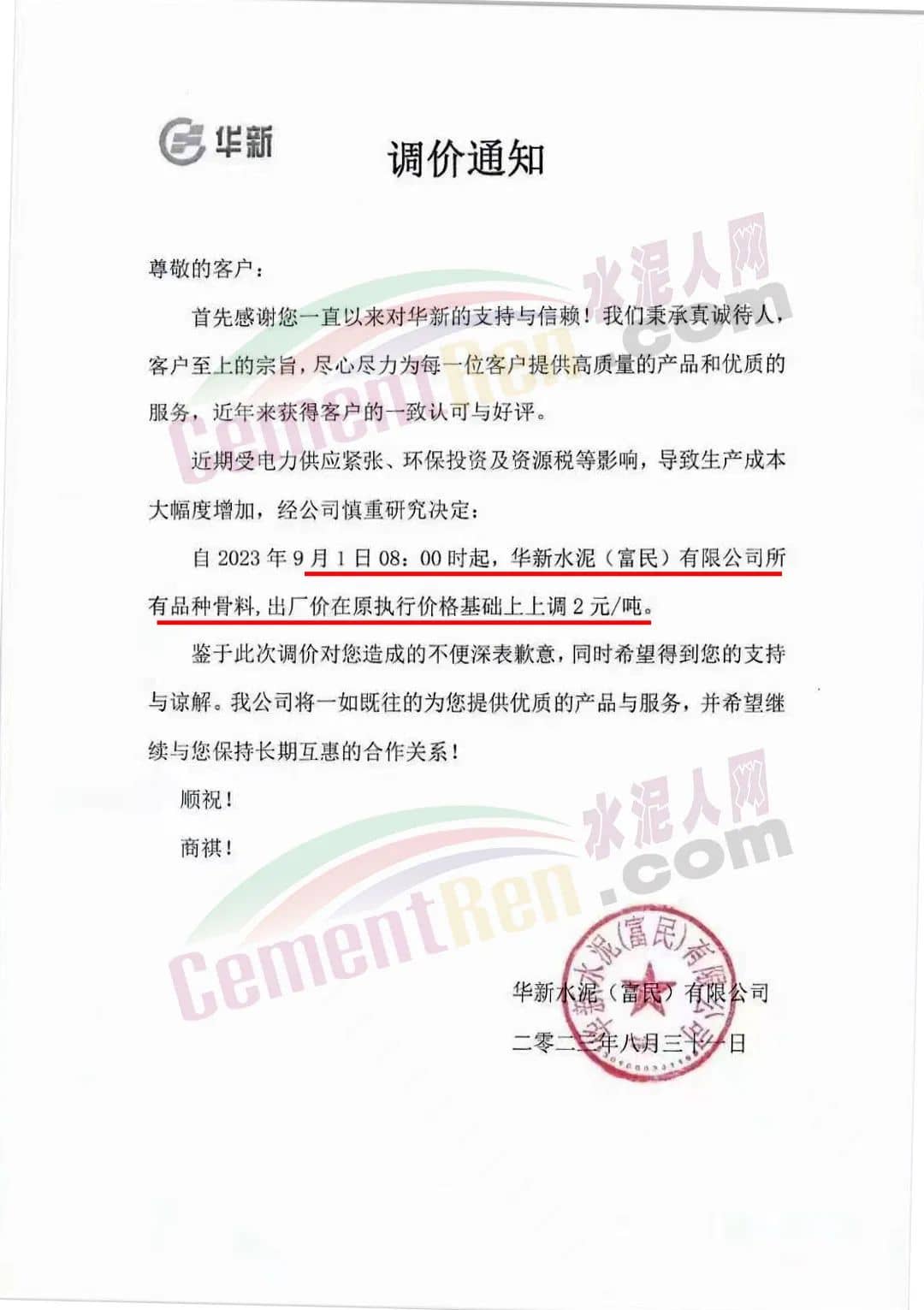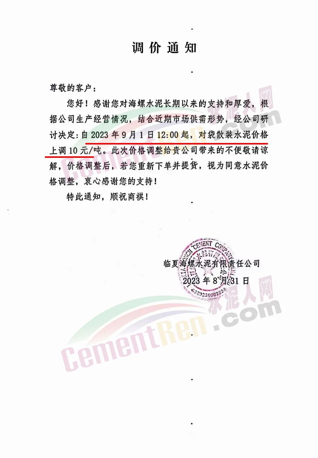 臨夏海螺水泥有限責任公司通知,根據公司生產經營情況,結合近期市場供需形勢,經公司研討決定:自2023年9月1日12時起,對袋散裝水泥價格上調10元/噸。