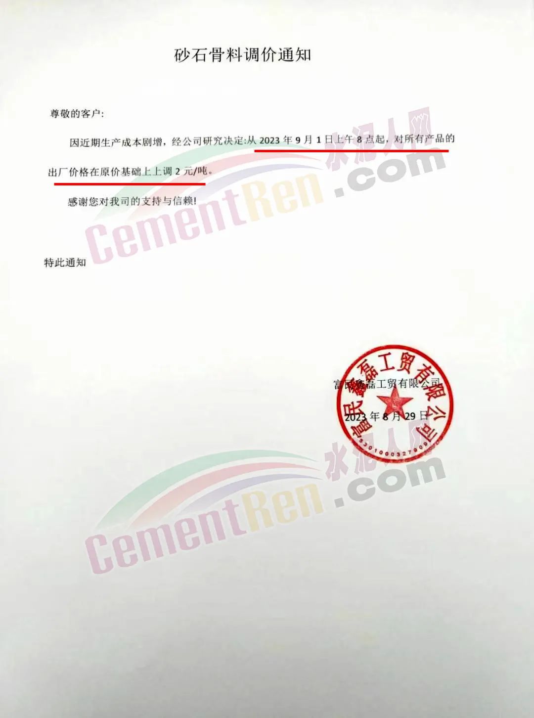 區域內主要品牌水泥企業除上調水泥價格外,還同步上調了骨料報價。華新水泥(富民)有限公司通知稱,近期受電力供應緊張、環保投資及資源稅等影響,導致生產成本大幅度增加,經公司慎重研究決定:自2023年9月1日8時起,華新水泥(富民)有限公司所有品種骨料,出廠價在原執行價格基礎上上調2元/噸。