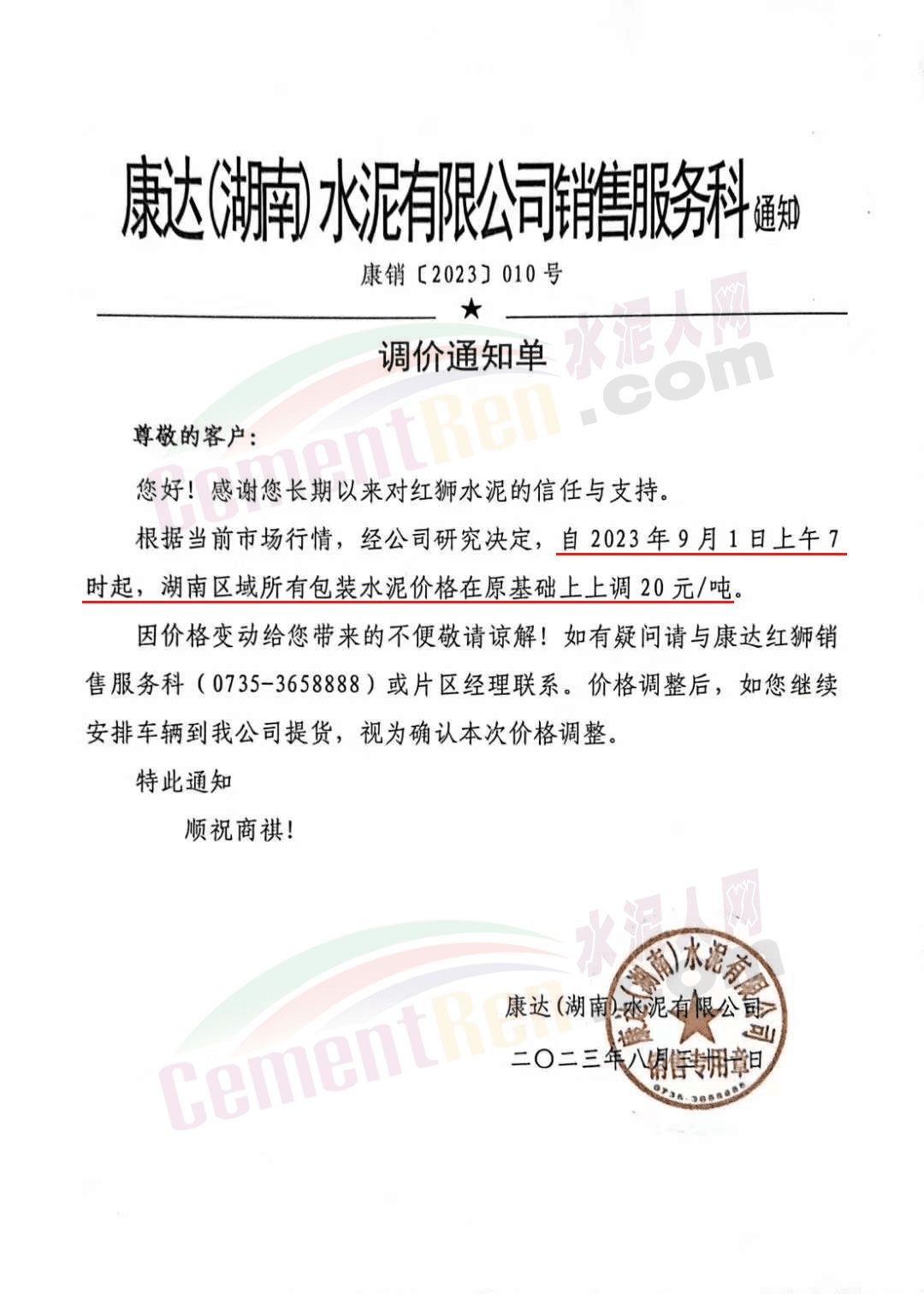 紅獅水泥旗下康達(湖南)水泥有限公司銷售服務科通知,根據當前市場行情,經公司研究決定,自2023年9月1日上午7時起,湖南區域所有包裝水泥價格在原基礎上上調20元/噸。