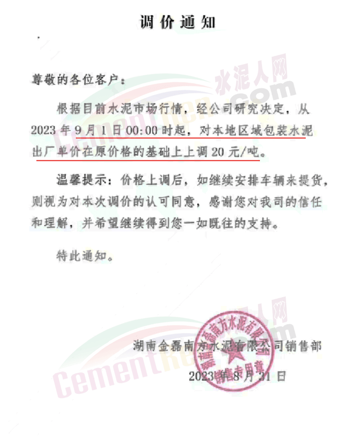 湖南金磊南方水泥有限公司銷售部通知,根據目前水泥市場行情,經公司研究決定從9月1日0時起,對本地區域包裝水泥出廠單價在原價格基礎上上調20元/噸。